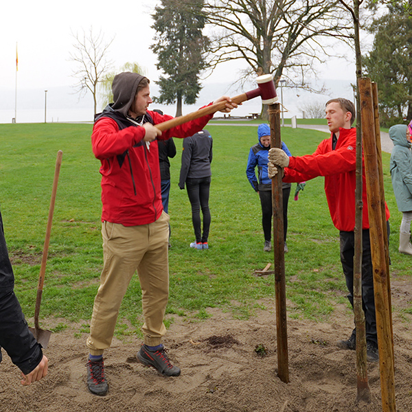 Das Horn in Richterswil ist als Spiel-, Freizeit- und Badeplatz beliebt bei Jung und Alt. Jedoch fehlen laut der IG-BAUMFREUNDE schattenspendende Bäume. Die IG möchte der Gemeinde 8 bis 10 neue Bäume schenken und sie in Absprache zusammen mit der ZHAW Wädenswil und der Gemeinde auf dem Horn pflanzen. Denn Bäume sind nicht nur schön anzusehen und spenden Schatten, sondern produzieren auch Sauerstoff, sorgen für ein angenehmes Klima und bieten Schutz vor Wind und Wetter. Zudem tragen sie zur Stabilisierung des Seeufers bei. Durch die Teilnahme an unserem Förderprojekt «Projekt1816» im Jahr 2023 und der einstimmigen Meinung der Sparcassa-Jury, dass es sich hierbei um ein unterstützungswertes Projekt handelt, kamen die IG Baumfreunde der Realisierung Ihres Projektes einen grossen Schritt näher. Am 26. März 2025 war es nun endlich so weit: die ersten Bäume konnten auf dem Horn gepflanzt werden. Zusammen mit Axel Heinrich von der ZHAW Wädenswil, er steht den Baumfreunden seit Jahren treu zur Seite, sowie helfenden Studenten, konnten die ersten 4 Bäume fachgerecht gepflanzt werden.