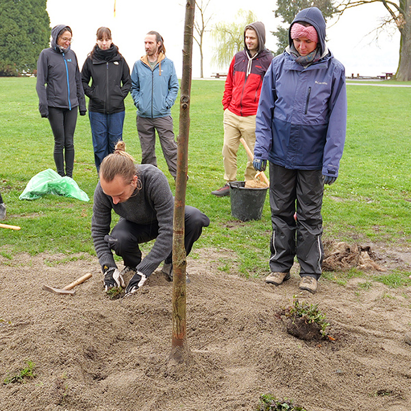 Axel Heinrich mit seinen Studenten beim Pflanzen der Bäume
